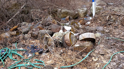 People have been dumping and partying here for years. A video from 2006 was taken by the new conservation agent after receiving a complaint about a pile of tires where the gas pipeline crosses Pearmain Road. The location can be reached by hiking south from the Land Trust's Nicholdale Farm property off of Rt 110 (location of a Scout camp).The area was then cleaned up, and Iroquois installed a heavy gate across Pearmain Road where the pavement ends. Sadly, the heavy chain locking the gate was cut, repeatedly. Everyone finally just gave up trying to keep it locked and the dumping continued.